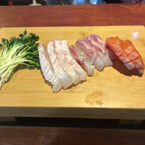 これは茶碗蒸しのような味がします。出てきたときは卵が踊っていましたよ。そして刺身がでてきます。おそらくふつうは2人前からなのだと思います。何度も一人かと聞かれたので、一人だというとわかってくれたのかもしれませんが、かなりの量がどんどんでてきます。サービスなのかな?初めはサーモン、ヒラメ、タイがでてきて、