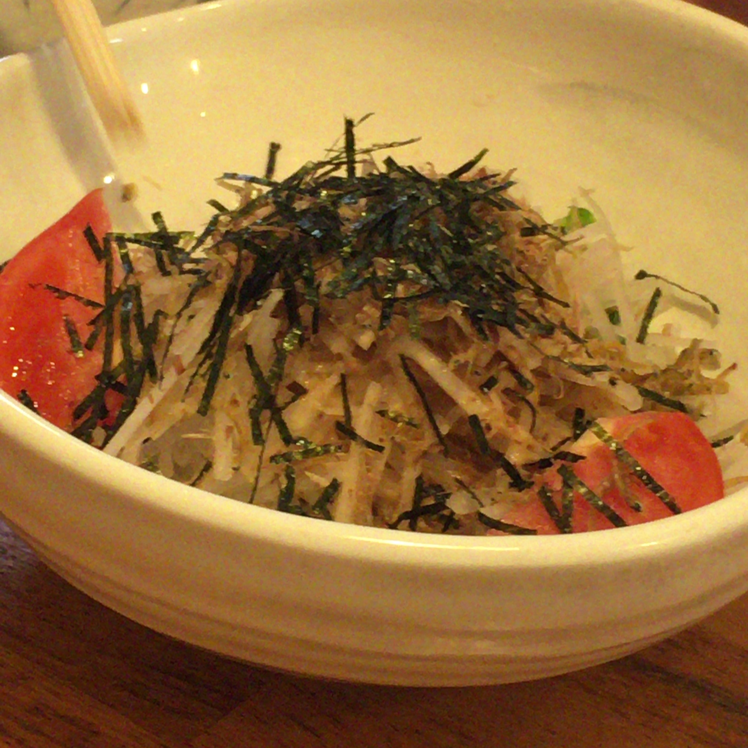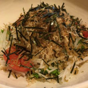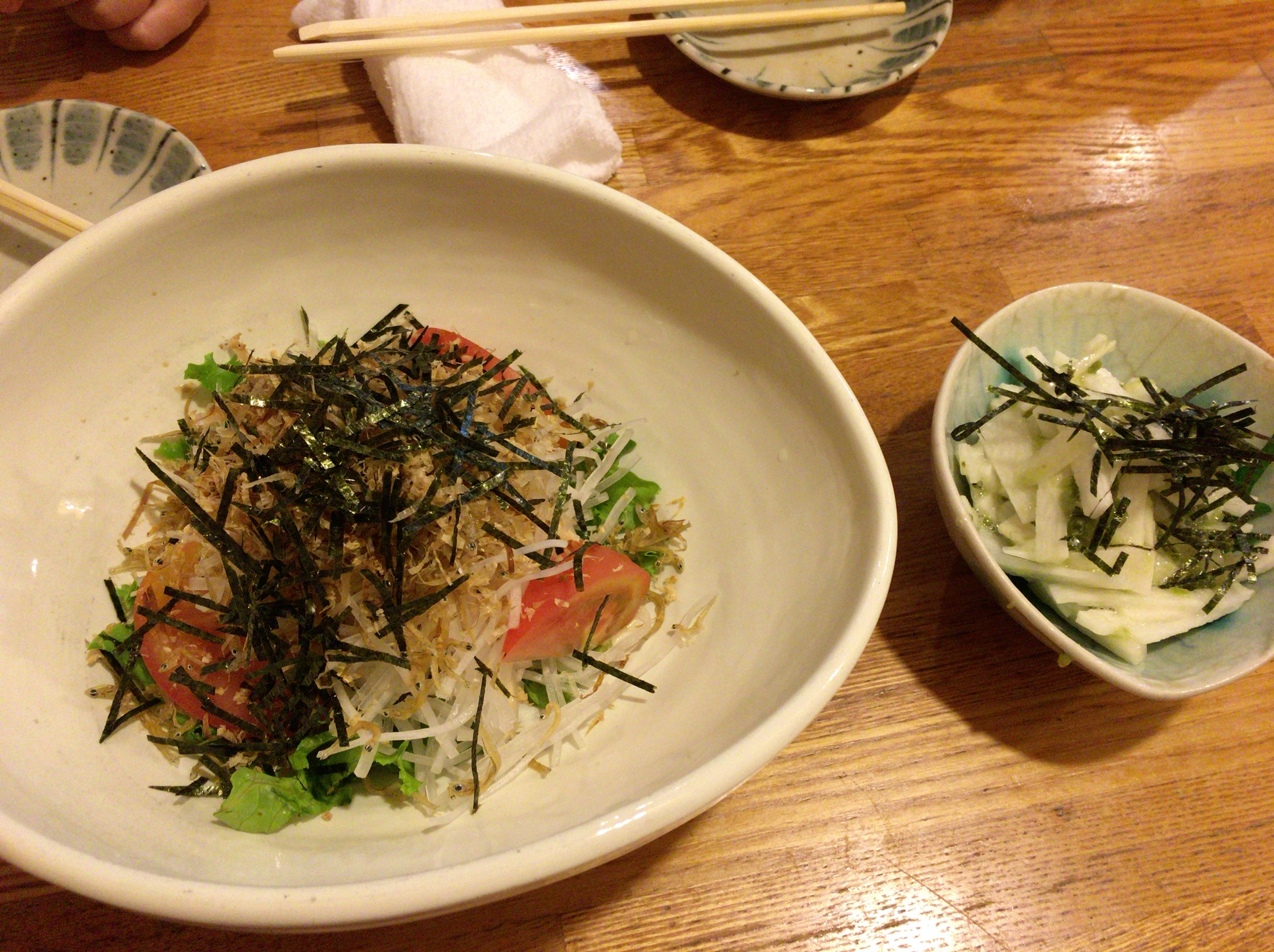 次は大根とじゃこサラダです。ここのじゃこばかりを娘は食べます。トマトも美味しいから食べてみればいいのに!この店のトマトはめちゃくちゃ甘いですよ!