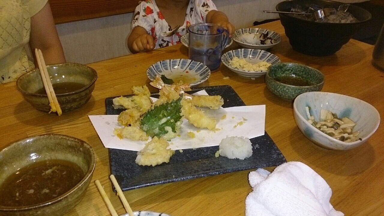 天ぷら、ナスギョウザ、カンパチの刺身、牛筋煮込みなどを注文し、大将と話をしながら、過ごしていると娘も大将を気になりだしたのか、あちこち動く大将を目で追いかけるようになります。