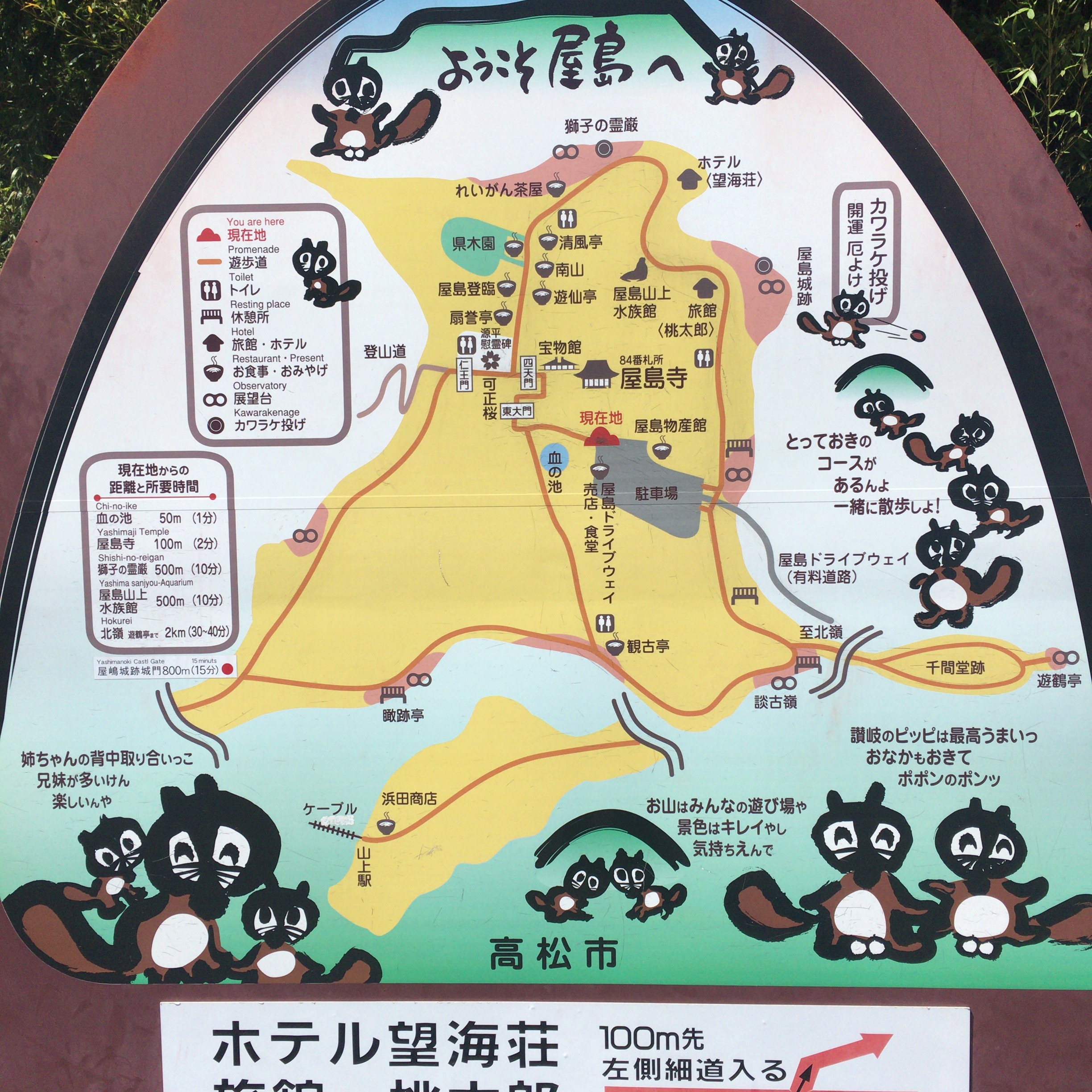 屋島の駐車場まで来ると、屋島を歩くルートを知ることができます。車を停めて歩いて屋島を回るわけです。1~2時間でグルッと回ることができます。