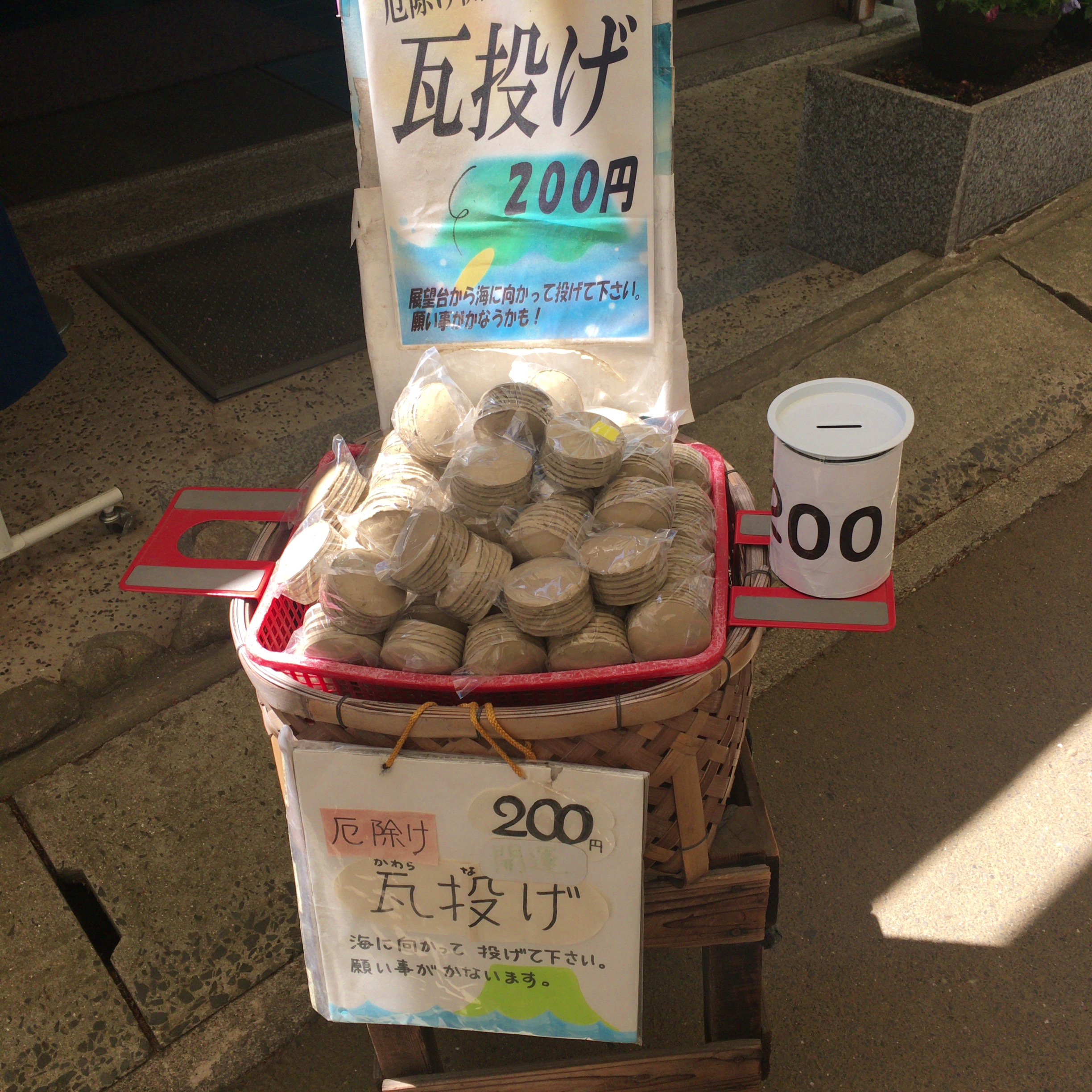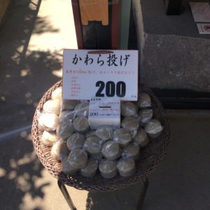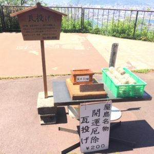 屋島寺を抜けると展望台があるのですが、そこに行くまでに何か所も瓦投げのアイテムが売っています。これは本当の瓦ではなく、土に還る粘土です。この粘土でできた瓦を展望台の上から投げるんです。