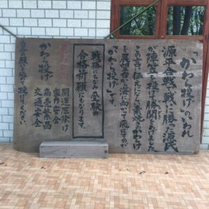 瓦投げは元々源平合戦に勝利した源氏が陣笠を投げたことが由来です。合格祈願の効果があるんだとか。