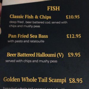classic fish and chipsです。白身魚とフライドポテトのイギリス定番の料理です。やはりイギリスではこれを食べないと日本に帰れないでしょう!タルタルソースにつけて食べると美味しいです。基本味付けはあまりありませんのでそのまま食べるのは難しいです。
