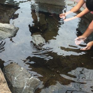 クマノミに触れる場所もあります!娘は喜んで魚に手を伸ばしていました。